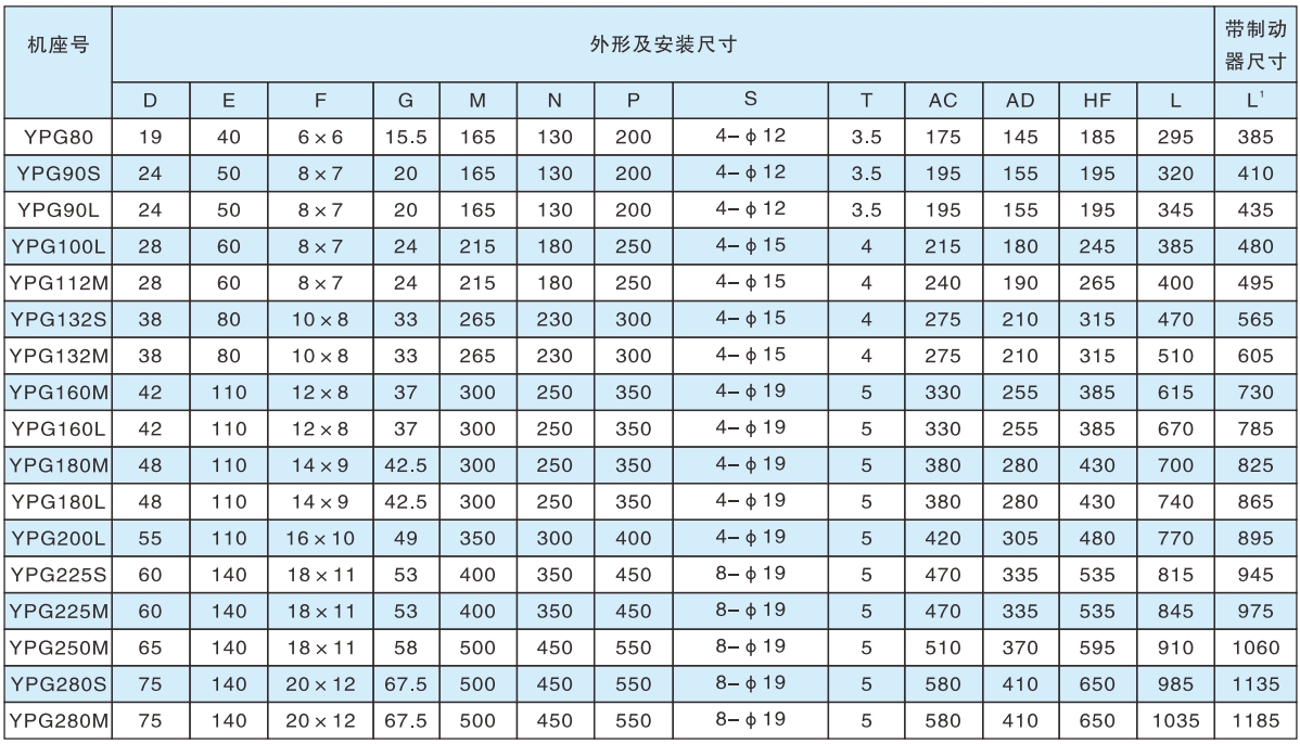 YPG系列三相异步电动机安装尺寸符合IEC标准,其安装尺寸与Y2系列三相异步电机动完全相同。主要性能如下:
